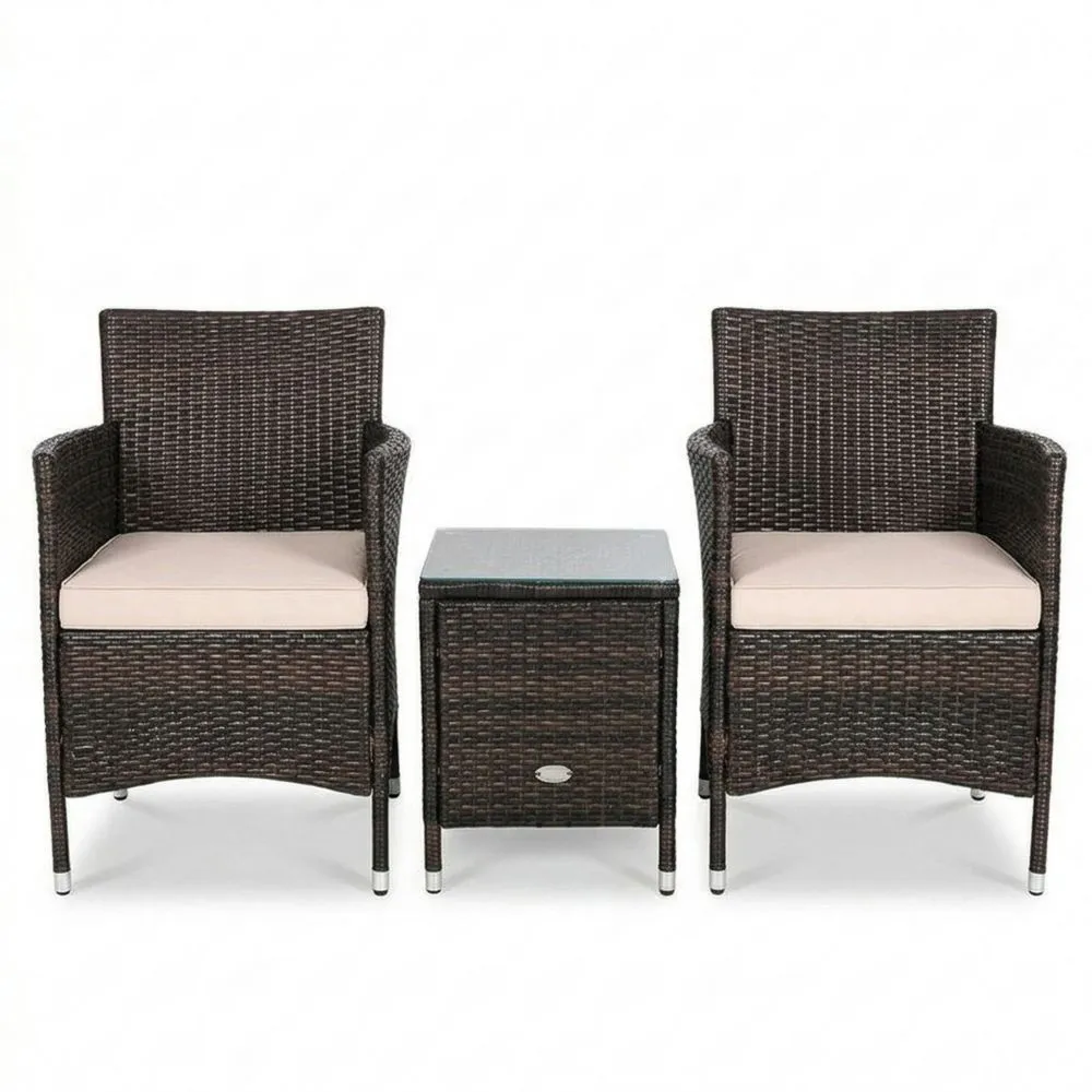 Rattan Gartenset 2 Stühle mit Kissen und Tisch Glasplatte Braun Beige