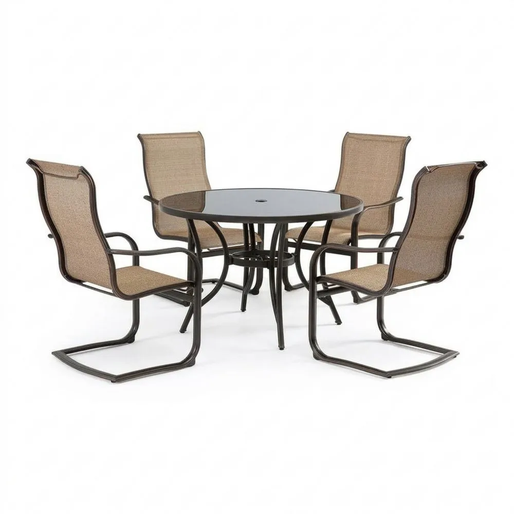 Runder Gartentisch aus Glas mit Stahlgestell und Textilstühlen Schwarz/Braun