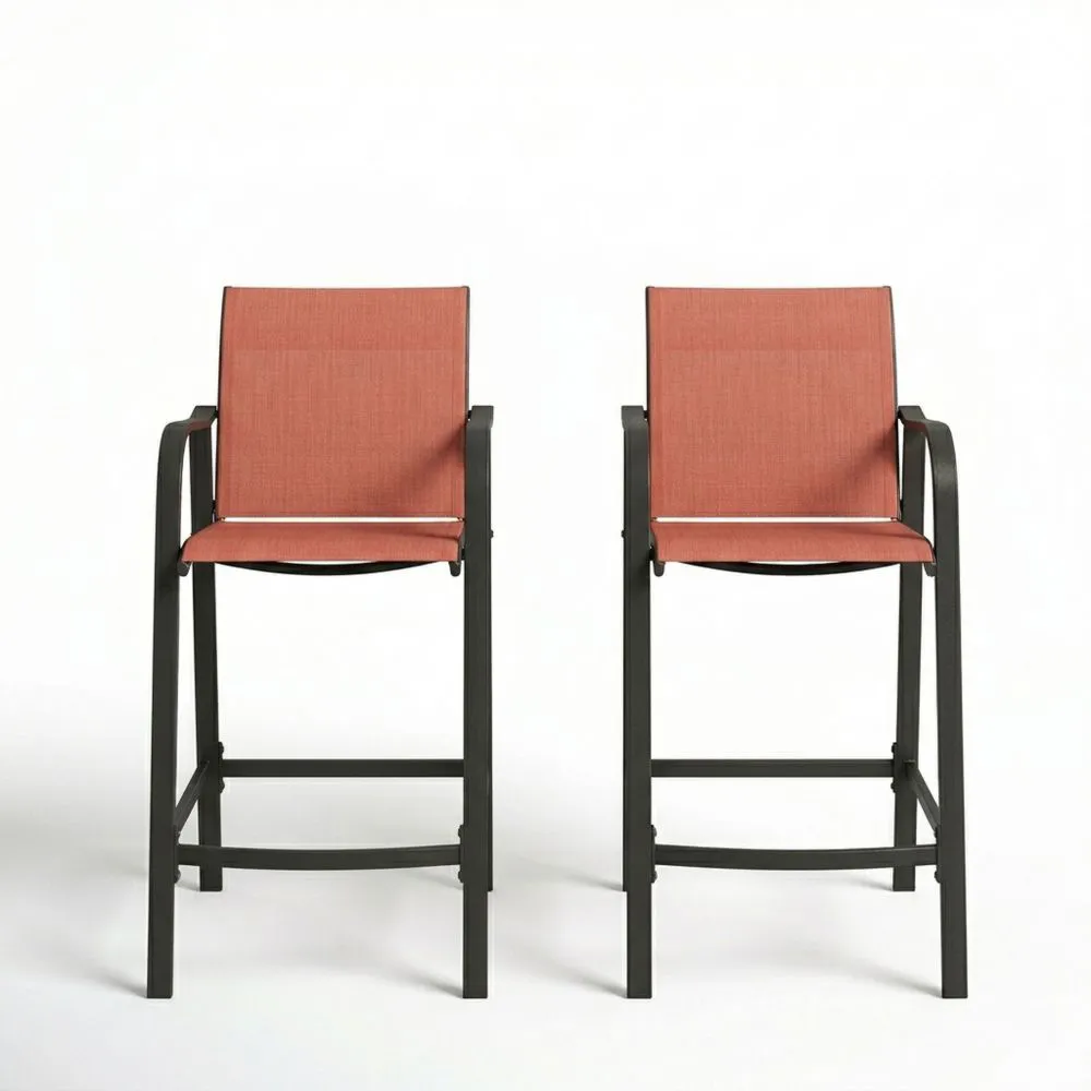 Es handelt sich um ein Set aus zwei Barhockern mit beschichtetem Stahlrahmen und Sitzkissen aus Polyestergewebe. Die Sitze sind in einem lebendigen Rot gehalten, während der Rahmen in Schwarz ist. Die Gesamthöhe beträgt 110 cm, mit einer Sitzbreite von 45 cm und einer Sitztiefe von 50 cm.